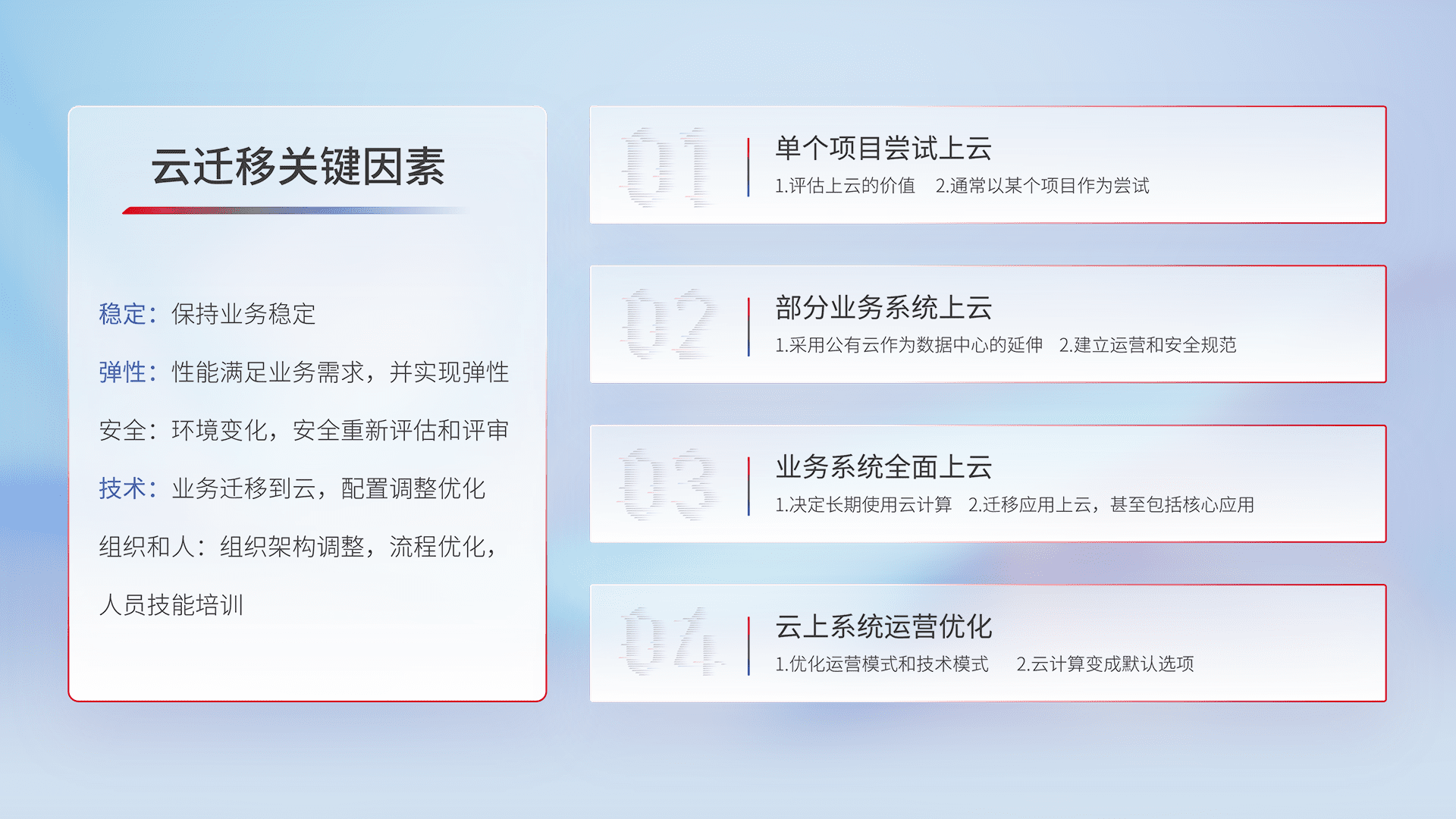 结合实际业务,,,,从规划设计、、、、云平台选型、、云原生改造、、数据迁移、、、集成交付,,,迁移全过程为客户识别最佳上云路径,,,做好风险识别管理,,,设计网络架构、、身份权限、、、、安全审计合规、、、、操作审计、、、日志审计、、、监控告警策略、、多站点容灾设计等,,,对云上基础设施进行整体规划,,提升IT治理水平,,,,以满足弹性、、、高可用、、、、高性能的需求。。
